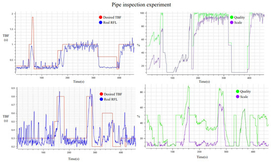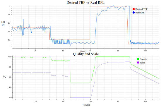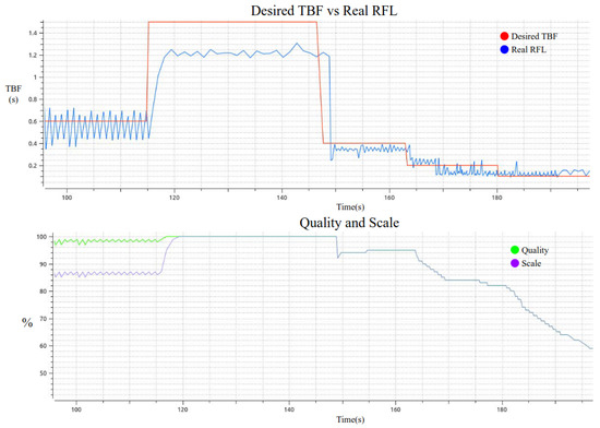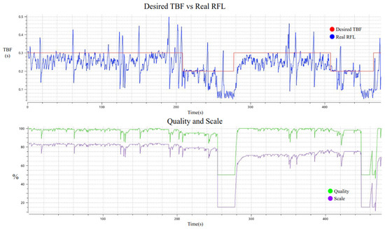 As in Figure 10, Figure 11 represents some changes in the desired TBF setpoint, except for a period from 45 s to the 60 s where the manual mode is executed. In this period, the scale and quality were fixed at 20% and 50%, respectively. This means that the real RFL does not follow the desired TBF signal. After second 60, the adaptive mode is activated, and the desired TBF is increased to 1 s, increasing quality and scale.