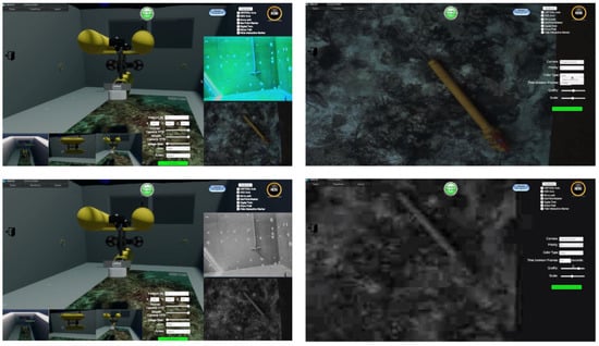 Network congestion image transfer was implemented, and the HRI was adapted to the pipe inspection experiment. Figure 13 shows two scenarios. The top left shows that the bandwidth is high enough to show two high-scale and high-quality RGB images. The bottom left shows the second case where the bandwidth is constrained and the images deployed in the HRI are low-quality grayscale images. It is important to mention that the HRI offers the option to change the controller’s mode, give priority to the scale and quality, or just change the mode to the adaptive or manual mode as explained in Section 3.1. Another important feature of the HRI is that if the operator clicks on any of the images, the image gets maximized, offering a better view. On the right side of Figure 13 two images are shown: one where the bandwidth is high (top) and the second one where the bandwidth is constrained (bottom).