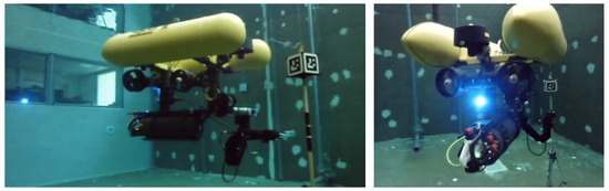 The underwater robot used for this experiments is the Girona500 from IquaRobotics [22] (Parc Científic i Tecnològic UdG, Edifici Giroemprèn. Pic de Peguera, 11, 17003 Girona (Girona), Spain). The dimensions of this robot are 1 m in height, 1 m in width, 1.5 m in length, and approximately 200 kg. This vehicle has 5 thrusters and is designed to provide passive stability in roll and pitch and to operate at a maximum depth of 500 m. The payload is equipped with a Reach Bravo 7 arm [23] for manipulation tasks. Navigation sensors are also available on the robot, including a Doppler Velocity Log (DVL), Attitude and Heading Reference System (AHRS), Global Positioning System (GPS), Ultra-Short Baseline (USBL), and pressure gauges, all of which are mixed in the Cola2 architecture [24] (Component-Oriented Layer-based Architecture for Autonomy). This ROS-based software architecture includes a full control stack, a localization module with a navigation filter, safety nodes, and all the drivers to communicate with the hardware.