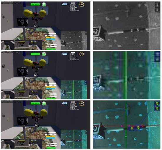 Similar to the pipe inspection task, the HRI was adapted to perform this intervention task. Principally because the communication was performed using a VLC modem and the need for supervision and decision making during the intervention, network congestion control was used for image transfer. Figure 16 shows three pictures of the intervention task with different bandwidths and different requirements of the operator. At the top of the figure, a medium-quality grayscale image is shown in the HRI. It the center, a low-quality RGB image is displayed. Lastly, a high-quality RGB image is shown on at the bottom. This figure exhibits the cases of the experiment where, depending on the bandwidth and the operator requests, the image compression was adjusted to prevent the congestion of the VLC network.