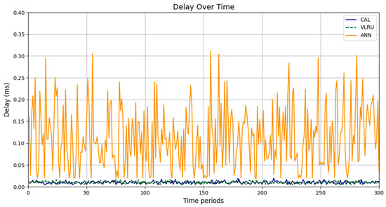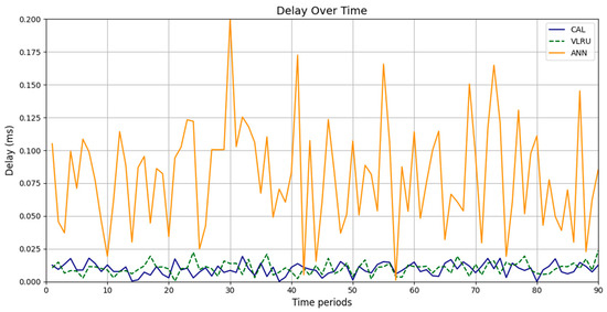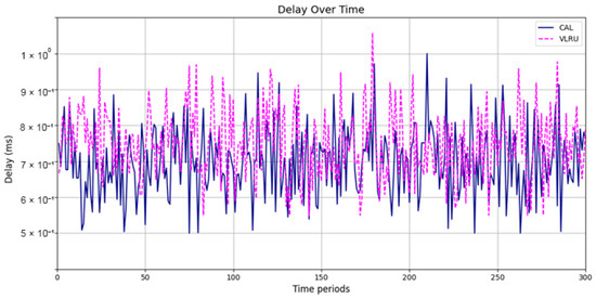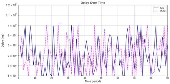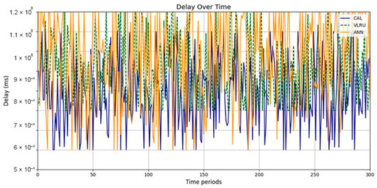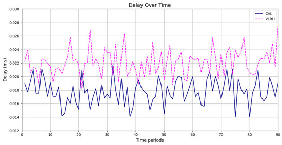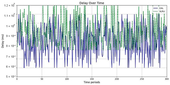 Network delay (D) represents the time taken for data to travel from the source to the destination across a network, affecting the overall response time in networked systems [31]. High network delays can result from long transmission paths, heavy network traffic, or processing delays at intermediate nodes. Reducing network delay is essential for applications requiring low-latency communication, including real-time video streaming, IoT systems, and online gaming. Effective caching mechanisms, such as the proposed method in your simulations, help lower network delay by reducing the need for frequent data retrievals from the source. Caching frequently accessed and up-to-date data enables the network to achieve faster response times and improve QoS, outperforming traditional caching approaches, such as LRU. Equation (2) was used to evaluate the delay [34]: