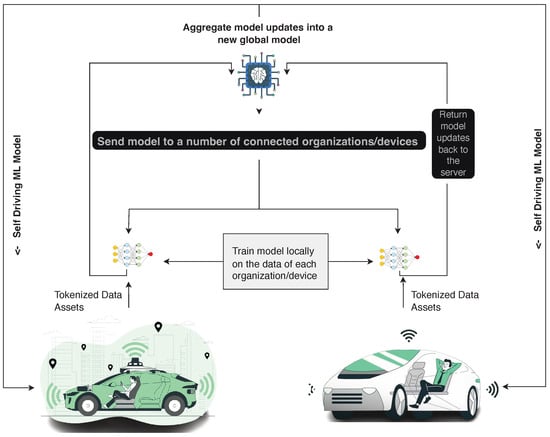 FL has emerged as a promising approach for distributed machine learning, enabling the training of models directly on edge devices where data are generated []. This decentralized paradigm enhances privacy by eliminating the need for raw data to leave local devices while also improving model adaptability by leveraging diverse datasets []. Figure 1 illustrates the distributed training concept within an IIoT context, demonstrating how edge devices contribute to a global model by processing localized data securely. While this figure focuses on autonomous vehicles, the underlying principles apply broadly across the IIoT spectrum, encompassing diverse sectors, such as manufacturing, energy, and healthcare.