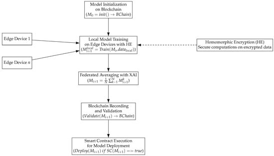 Building on this, Figure 3 provides a detailed workflow of the framework, presenting a step-by-step view of its processes. The workflow begins with model initialization on the blockchain, where the initial model parameters are securely recorded to ensure transparency and integrity. Next, local model training occurs on edge devices using HE, allowing computations to be performed on encrypted data. The updates from edge devices are then aggregated using federated averaging, with XAI integrated to analyze feature importance and refine the global model. The aggregated global model is validated and recorded on the blockchain in the blockchain recording and validation stage, ensuring only authenticated updates are included. Finally, smart contract execution automates the deployment of the validated model to edge devices if predefined quality standards are met.