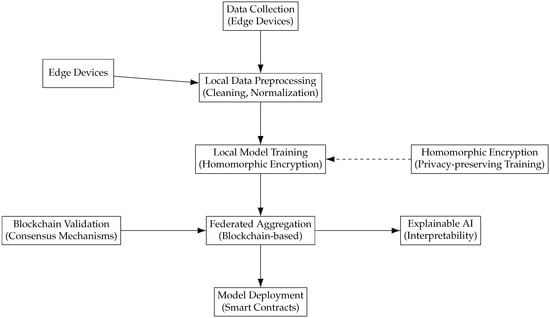To provide a clearer understanding of the framework’s workflow, Figure 4 illustrates the preprocessing stages and the key elements of the proposed framework, providing a clear depiction of the FL process. The diagram begins with data collection at edge devices, followed by local data preprocessing stages, including cleaning and normalization, ensuring data quality. The workflow then transitions to secure local model training with homomorphic encryption, which preserves privacy. Federated aggregation, facilitated by blockchain, ensures secure and immutable communication, while XAI enhances interpretability by providing insights into model behavior. The refined model is subsequently deployed to edge devices via smart contracts, completing the process. This comprehensive visualization enhances understanding of the framework’s workflow and its practical application in IIoT environments.