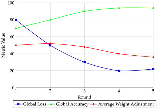 The results projected in Figure 5 demonstrate the consistent reduction in global loss across training rounds, coupled with an increase in global accuracy. These trends confirm that the model successfully generalized across distributed datasets, enhancing predictive accuracy. The average weight adjustments depicted in Figure 4 further validate the effectiveness of the FL aggregation mechanism, showing convergence toward an optimal global model by leveraging diverse local data contributions.