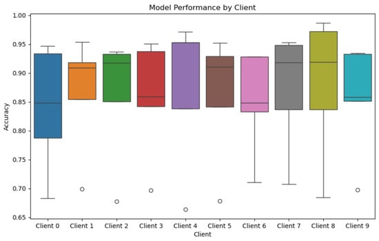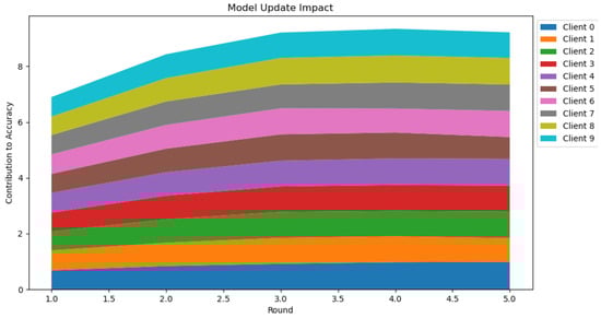 To further analyze the role of FL in the experimental results, Figure 6 highlights the contributions of individual client nodes to the global model’s training process, demonstrating the diversity of local datasets and training conditions. FL’s weighted aggregation mechanism effectively balances these variations, enabling the global model to benefit from heterogeneous data while maintaining privacy. Nodes with higher data quality and larger datasets had a more significant influence on the global model, reflecting the robustness of the FL approach. This decentralized mechanism ensured consistent reduction in global loss and improved accuracy, as shown in Figure 5, while preserving data privacy. FL’s ability to aggregate insights from distributed nodes without sharing raw data underscores its suitability for privacy-sensitive IIoT applications, making it a pivotal component in achieving the experimental outcomes.