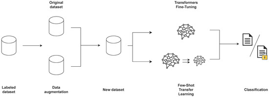 As explained, in this work we perform a task that aims to classify security and non-security requirements. Figure 1 shows the workflow of the described process. We relied on a labeled dataset composed of a description of both security and non-security requirements in the natural language. Additionally, since the dataset, described deeper in Section 3.1, was imbalanced, we relied on three different data augmentation techniques. Also, to perform the classification task, we fine-tuned four pre-trained transformer models using the four datasets (the original one and the three augmented). Finally, we employed few-shot learning techniques by leveraging transfer learning models, explicitly utilizing pre-trained architectures using the four datasets.