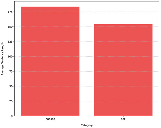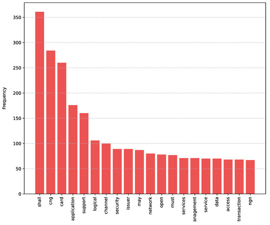 In order to conduct our experiments, we used the publicly available dataset SecReq introduced by Knauss et al. [17]. This work aimed to assist all steps in eliciting security requirements and provide mechanisms to trace security requirements from high-level security statements (security objectives) instead of secure design. This dataset contains 623 requirements, 415 security-related, and 208 non-security-related requirements (Table 1 shows an example per class). It is composed of three industrial specifications: (1) Common Electronic Purse (ePurse), (2) Customer Premises Network (CPN), and (3) Global Platform Specification (GPS). During the dataset analysis, we calculated the length distribution of the requirements, finding (as shown in Figure 2) that, on average, the non-security-related requirements are more extended (with an average number of characters of 183.52) than security-related requirements with an average length of 154.05. Additionally, we conduct a word frequency analysis showing the 20 most frequent words in the requirements. Figure 3 shows that the most used word is the verb “shall”, which, also seeing the example shown in Table 1, indicates a requirement or obligation; it is often used in legal, technical, or formal documents to express that something is mandatory or must be conducted, and for this reason in this context, this word is the most used. The latter verb is followed by “cng”, which is the acronym for “Common Name Group”. It categorizes and groups similar security requirements based on common characteristics or themes. The last word in the figure is “ngn”, which refers to “Next Generation Network”. These advanced telecommunications networks provide a wide range of services, including voice, data, and multimedia.