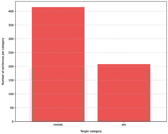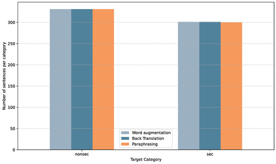 As described in the previous section and as visible in Figure 4, the number of requirements for security (166) and non-security categories (331) are unbalanced. This data type could lead to a model that may perform poorly on underrepresented classes. This imbalance can result in biased predictions, as the model favors the majority class. To address this issue, data augmentation techniques can be employed to enhance the representation of minority classes. In this work, we relied on three approaches: word augmentation, back translation, and paraphrasing. Regarding word augmentation, this technique generally consists of generating new random variations of words or phrases in a text. However, in this work, we applied a strategy that relies on a pre-trained BERT model [18] to generate contextual embeddings and add for each requirement three new sentences by randomly adding, removing, or substituting words in the sentences. Using this approach, the model identifies a target word and suggests alternatives based on the surrounding context, ensuring the replacement maintains the original sentence’s semantic integrity. This process enriches the training dataset and helps us mitigate issues related to class imbalance. Instead, back translation is an augmentation technique used in natural language processing (NLP) that involves translating a sentence from the source to a target language and then back to the original language. In this phase, using Google Translate (https://translate.google.com/, accessed on 18 October 2024), we translate each sentence in the training dataset to a random language and translate it back to English. Finally, paraphrasing involves generating alternative versions of a given text while preserving its original meaning. In this process, we used three different Large Language Models to generate three different versions from the starting requirements. The first of these three models is based on the T5 (Text-to-Text Transfer Transformer) [19] architecture, which treats every NLP task as a text-to-text problem. The T5 model is pre-trained on a diverse range of tasks and can generate paraphrases by understanding the context and semantics of the input text. It excels in generating coherent and contextually relevant paraphrases. The second involved model is GPT-Neo [20], an open-source alternative to OpenAI’s GPT-3 and, with its 2.7 billion parameter version, can generate human-like text based on the input it receives. It can perform various tasks, including text generation, completion, and paraphrasing. Its large size allows it to capture complex language patterns, making it practical for generating diverse and creative paraphrases. Finally, Pegasus [21] is a model specifically designed for text generation tasks, particularly summarization and paraphrasing. It uses a transformer architecture and is pre-trained on a large text corpus. The variant used in this work is fine-tuned for paraphrasing tasks, allowing it to effectively produce paraphrases that maintain the original meaning while varying the wording and structure. We submitted each requirement to each model, indicating to the model to perform the paraphrasing task and adding each result to the new dataset. Table 3 shows an example of an original dataset requirement and the related variants generated using the abovementioned techniques. In contrast, Figure 5 shows the dataset size after each of the three processes that allowed us to rely on a more balanced dataset.