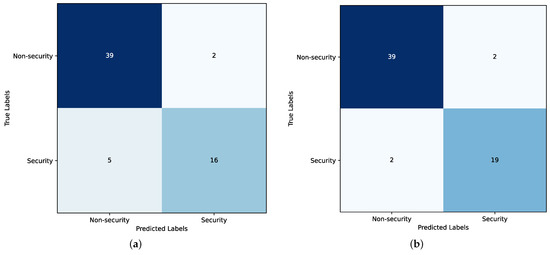 To evaluate the impact of dataset augmentation on the performance, we created the confusion matrix of the BERT model in the standard dataset and the contextual word augmentation and compared them. As can be seen in Figure 6a, in this matrix, the model correctly identified 39 non-security requirements (True Negatives) and 16 security requirements (True Positives). However, it misclassified two non-security requirements as security (False Positives) and failed to identify five security requirements (False Negatives). In contrast, the confusion matrix (Figure 6b) for the model trained on the augmented dataset maintained the same True Negatives (39) and False Positives (2) as the original model, indicating consistent performance in identifying non-security requirements. The augmented model significantly reduced the False Negatives to 2 and increased the True Positives to 19. This improvement suggests that the augmentation process enhanced the model’s ability to classify security requirements accurately. Overall, the results indicate that contextual word embeddings for dataset augmentation positively influenced the model’s performance, leading to a more effective classification of security-related requirements.