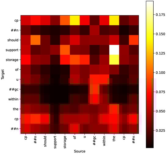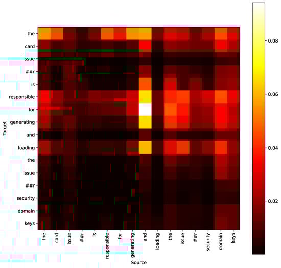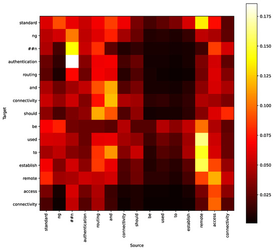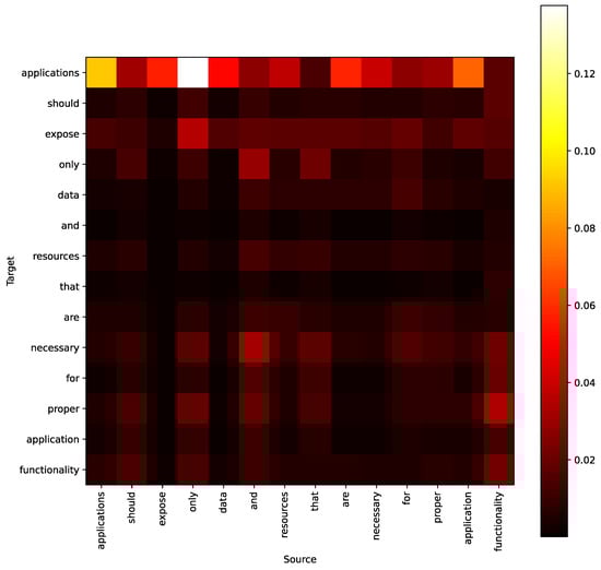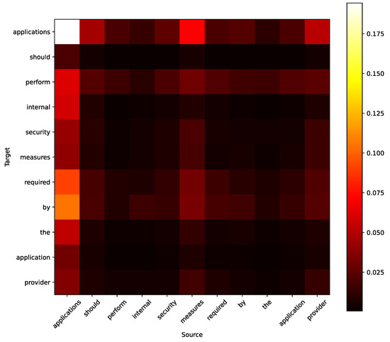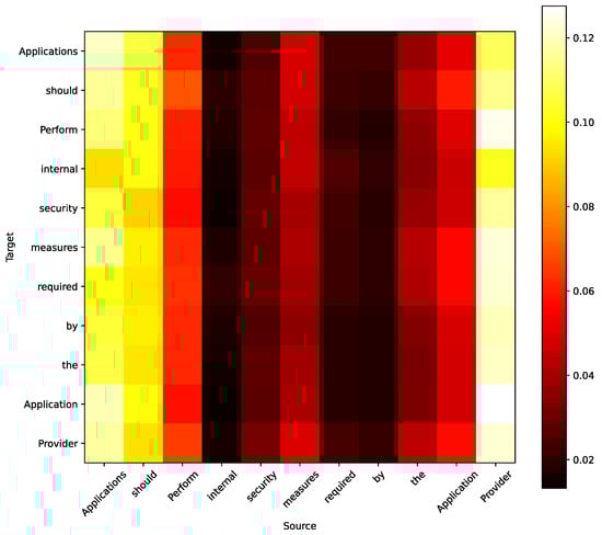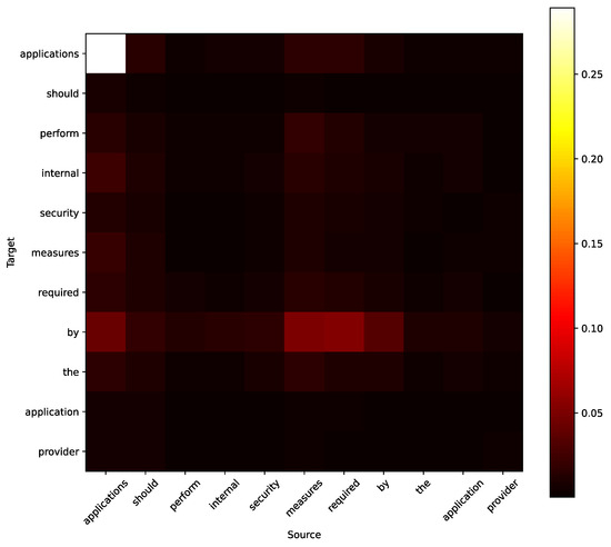 Within the dataset on word augmentation, the BERT model was selected, and further confirmed through the corresponding attention heatmap (Figure 8) that focuses more on several keywords: “internal”, “security”, and “required”. In this case, the attention is exploited more towards those words, which are supposed to be the target words of a security requirement itself, ignoring the contextual words more than RoBERTa does. The increased focus on those terms of interest also matches the word-level augmentations presented in the word augmentation from this dataset. At the same time, as BERT focuses on the core purpose of the security requirement, the noise in the word-augmented dataset does not adversely affect it, as BERT ignores the additional changes introduced by word augmentation techniques. Such a focus attention strategy might be why BERT obtains high accuracy and F1 scores, which had the word-level augmentation.