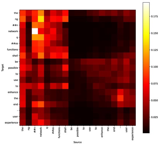 Considering the non-security requirements outlined in Table 7, Figure 13 depicts that the terms “authentication,” “routing,” and “connectivity” are relatively more prominent in the sentence. This is expected because these terms carry technical connotations. On the other hand, no word or term seems to have the highest concentration, so the attention is still spread across the sentence. For example, terms like “authentication” do not receive sufficient attention or relevance to security. Such a distribution reinforces the classification as a non-security requirement as no vital security-related keywords are identified. Instead, for the second sentence, the attention map (Figure 14) reflects the model’s understanding that this sentence relates to quality of service (QoS) and user experience enhancement rather than security concerns. The absence of words like “security”, “access control”, or “encryption” ensures a non-security classification, showing that the model can handle ambiguous terms like “functions” and “network” without misclassifying them as security-related. In the last sentence in Figure 15, attention focuses marginally on “storage” and “UGC” (user-generated content), as these terms imply functionality. However, the overall attention remains weak and scattered. This focus suggests that the model recognizes functional relevance but does not misinterpret these as security-critical elements.