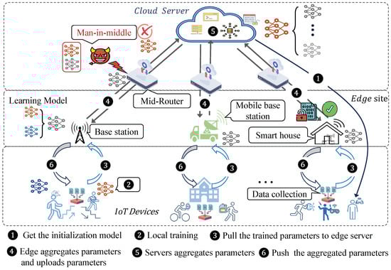 With the rapid development of the Internet of Things (IoT) and edge computing, an increasing number of devices are being deployed, leading to the generation of vast amounts of data. These data, often generated in sensitive environments such as healthcare, smart homes, and industrial systems, demand high communication efficiency and strong privacy protection mechanisms []. Ensuring data privacy while maintaining system efficiency has become a critical challenge in IoT environments, where numerous devices are interconnected and generate continuous streams of information [].