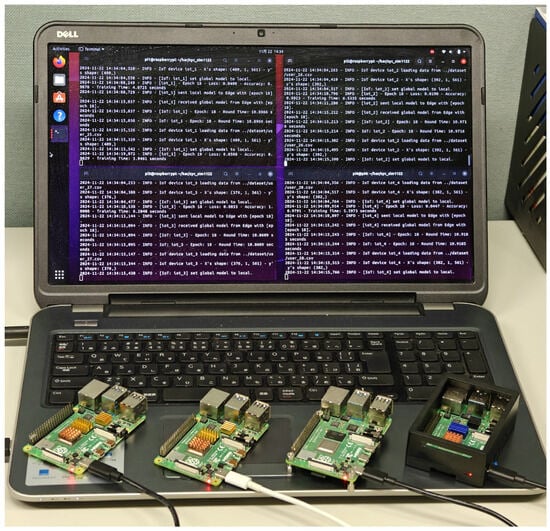 This section describes the experimental setup for evaluating the proposed hierarchical federated-learning framework in a real-world IoT-Edge-Cloud scenario. The experiments are conducted using four Raspberry Pi devices, three PCs, and a human activity recognition dataset, where each IoT device represents a different individual’s activity data.