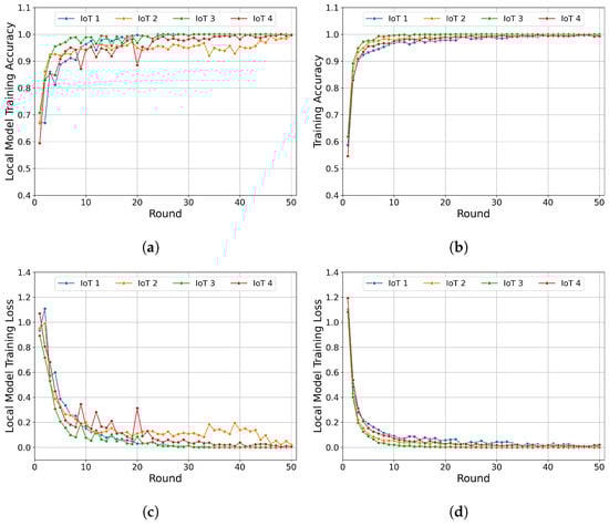 The practical implications of this additional overhead are further validated by the consistent round times observed across devices. Although training time varies slightly (ranging from 4.13 to 5.95 s), the overall round time almost remains consistent, demonstrating the framework’s effective balancing of device-level tasks. The negligible impact on device resources ensures that IoT devices can maintain their primary focus on training and communication without being constrained by security mechanisms.