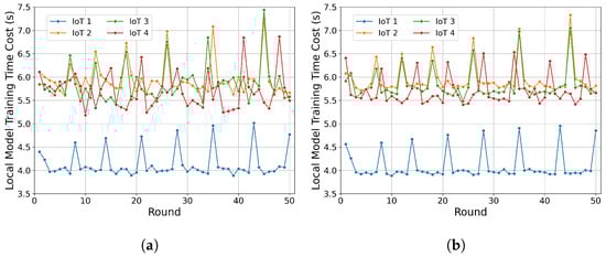 The asynchronous framework’s ability to tolerate outliers is particularly evident in scenarios where individual devices experience temporary spikes in communication time. For example, IoT 2 occasionally exhibits communication delays of up to 14 s. Despite such fluctuations, the overall system time remains stable due to the asynchronous handling of updates, which prioritizes aggregate progress over strict synchronization.
