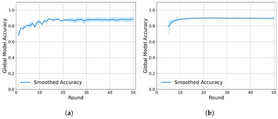 The results demonstrate that the additional overhead introduced by our framework is minimal. Specifically, the average encryption and decryption time per round is approximately 0.066 s, accounting for less than 1% of the total round time (ranging from 8.48 to 10.28 s). This minimal computational cost underscores the practicality of the framework in resource-limited IoT environments. Additionally, since federated learning involves transmitting fixed-size model parameters, the encryption process does not increase the size of the transmitted data. As a result, the communication time remains unchanged, ranging from 3.94 to 4.35 s, further confirming the framework’s scalability.