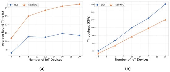 Scalability is a critical aspect of IoT frameworks, particularly in large-scale deployments where efficient communication and computation are essential. Figure 7a,b describe the scalability evaluation of our method compared to HierFAVG by analyzing average round time and throughput across varying numbers of IoT devices, including 4, 8, 12, 16, and 20.