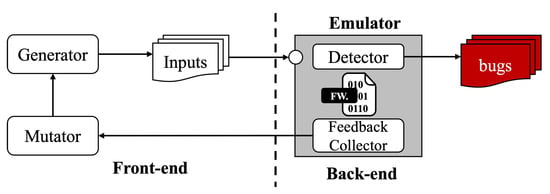 Fuzzing refers to an automated software testing technique that providing invalid, unexpected, or random data as inputs to a computer program to test whether the program perform as expected, which has been widely used in vulnerability detections. In general software fuzzing, the process includes input generation, delivery, execution, feedback collection, and feedback-guided input mutation. It is divided into a front-end (input generation and mutation) and a back-end (execution environment and feedback). In firmware fuzzing within an emulation environment (see Figure 4), the emulator serves as the back-end, facilitating (1) test case reception, (2) emulated execution, (3) feedback collection, and (4) crash detection. The emulated execution environment relies on CPU and peripheral emulation. Inputs should be delivered when the firmware reads data from peripherals, as fuzzing aims to uncover software bugs, which are more exploitable than hardware bugs. Unlike general software with defined data I/O interfaces (as discussed in F2 and F3 in Section 2), identifying external input/output interfaces in black-box firmware is challenging. For feedback, fuzzers mainly use code coverage, requiring the emulator to support instruction emulation at the basic block level and collect path and basic block feedback [15]. For bug detection, general fuzzers detect bugs by using existing security mechanisms within the target system or an integrated sanitizer. The sanitizer identifies bugs by detecting undefined or suspicious behavior through instrumentation code inserted by the compiler at runtime. However, MCU firmware, often using RTOS or bare-metal resources, lacks these mechanisms and source code for instrumentation, leading to undetected memory corruptions, also known as “silent” bugs [16]. Therefore, the emulator needs to support more fine-grained memory monitoring for bug detection. An ideal fuzzing application on an emulator should have low false-positive and -negative rates for bug detection and testing at high speed.