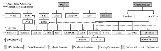 In this section, we summarize and reorganize the tools from all the research included in Figure 1, categorizing them by the main challenges they address. As shown in Figure 5, since CPU emulation is a fundamental component of firmware emulation, the following works all depend on CPU emulation tools. Tools built on the same platform are generally compatible, as demonstrated by the compatibility between Fuzzware and Halucinator.