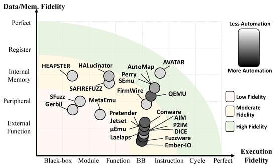 - Fidelity VS Automation: To achieve higher-fidelity peripheral modeling, simply analyzing firmware itself for general peripheral modeling is insufficient. Specific modeling for different peripherals requires hardware information. Extracting this information directly from the device can lead to hardware dependence issues, while obtaining it from hardware reference manuals or driver code is complex and error-prone. This complexity demands more human effort and reduces automation in high-fidelity modeling, as shown in Figure 6. In contrast, when focusing on a specific application domain, achieving high-fidelity peripheral emulation may not be essential. For instance, HAL-based solutions, as discussed in [24], can be utilized for testing application code exclusively. However, these solutions necessitate the manual implementation of replacement functions. Similarly, partial emulation can be employed to identify bugs that are less pertinent to peripheral operations, such as specific heap-related issues [37], which demand higher-fidelity emulation solely in memory. Nonetheless, the removal of peripheral-dependent code often requires manual intervention, which can impede automation due to indistinct boundaries and custom interfaces, as elaborated in Section 2. In summary, high-fidelity firmware emulation results in reduced automation, as illustrated in Figure 6 and Table 2.