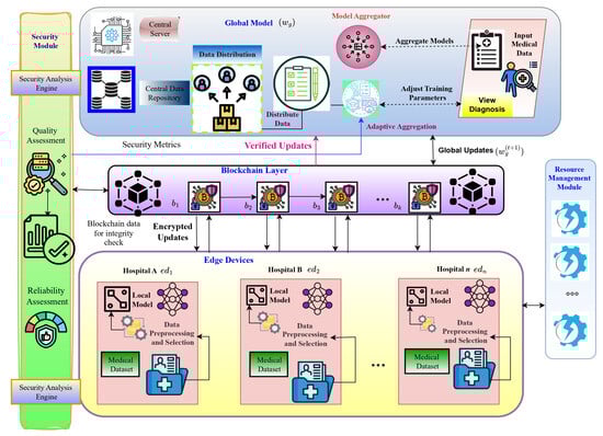 The geographically distributed IoMT networks, where medical devices and edge computing resources are deployed across multiple locations, offer key advantages such as reduced latency in critical care scenarios, improved resilience, and enhanced compliance with regional health data regulations. These architectures are vital for meeting the demands of global healthcare delivery and ensuring uninterrupted service during localized disruptions or emergencies [6]. However, they offer significant safety concerns. The need to protect sensitive health information across a variety of locations, defend against a broader spectrum of online cyber threats, and ensure compliance under distinct healthcare regulatory standards increases layers of complexities as cited in [7]. Although several advanced security measures have been designed for IoMT, significant barriers still remain in meeting the security requirements of geographically dispersed healthcare networks. These problems include critical communication overhead that causes latency in time-sensitive medical applications, challenges with data integrity across various medical devices, and scalability issues arising from the incapacity of current security mechanisms to manage increasing amounts of health data [8]. Additionally, it is common for medical device combinations to be non-standardized, which leads to hazards and discrepancies. Inadequate visibility in auditing and monitoring further contributes to the inability to identify and address medical security issues in healthcare settings [9]. Furthermore, providing comprehensive security will require a lot of processing and storage power for a medical device with limited resources, which will affect its overall effectiveness and cost. Due to these difficulties, an effective solution for IoMT contexts is urgently needed. The suggested architecture, EdgeGuard, combines federated learning’s privacy with blockchain’s decentralized security [9,10]. It is specifically designed for the IOMT. This is the whole framework that, on the one hand, enhances health data security and optimizes resource management in collaborative healthcare environments and, on the other, permits safe and effective cooperation between dispersed medical devices and edge nodes.