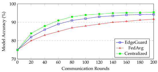 Figure 2 presents how the accuracy of the model converges to rounds of communication in EdgeGuard compared to standard federated learning (FedAvg) and a centralized approach.