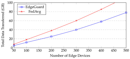 EdgeGuard outperformed FedAvg in terms of communication efficiency, cutting the overall amount of data sent by as much as 30%, especially as the number of edge devices rose.