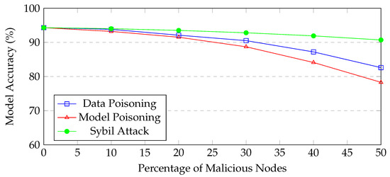 Figure 4 illustrates EdgeGuard’s performance under varying percentages of malicious nodes for different types of attacks.