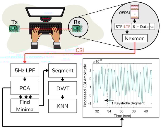 In Figure 3, we illustrate the algorithm for CSI-based keystroke recognition. As before, Tx propagates a Wi-Fi signal (red) which incurs time-varying oscillations due to the typing hand. This time varying Wi-Fi signal is then received by Rx. The CSI time series is first processed with a lowpass filter to remove noise above the cutoff frequency of 5 Hz. Then, the 56 time series (one for each of the 56 OFDM subcarriers) are collectively processed via PCA. The 2nd, 3rd and 4th PCA vectors are used in parallel for all subsequent computations.