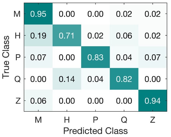 In Figure 5, we present a confusion matrix of the ML algorithm when evaluated with our experimental data. The rows represent true classes, and the columns represent predicted classes. Hence, the leading diagonal represents the true positive rates for each key, with darker colors corresponding to higher rates. We observe that the classifier has an overall true positive rate of . The largest error occurs when classifying the H key being pressed, which is incorrectly predicted as M of the time. The misclassification between these two classes can be explained by observing the relative proximity of the M and H keys on a keyboard. Furthermore, the worst performing class overall is the H key, with a true positive rate of . This once more reflects the position of the H key, in between all the other keys. Overall, this result supports those achieved in prior work [], demonstrating the threat posed to user keystroke information by Wi-Fi sensing.