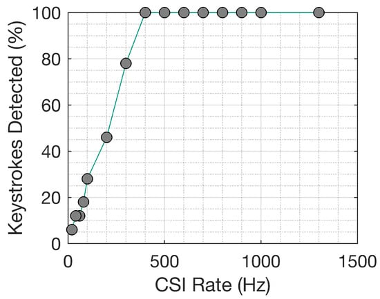 In Figure 6, we present a result that demonstrates the effect of the CSI data rate on the keystroke detection algorithm. The x-axis represents the data rate (Hz) of the sensing system, and the y-axis represents the percentage of 50 keystrokes that were detected from the CSI. Then, each plotted point represents an empirical result. Here, we note that detection refers to the ability of the system to extract a keystroke event from the CSI waveform, not the classification accuracy.