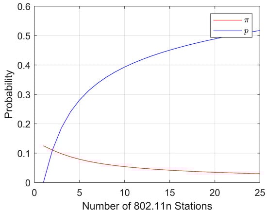 In Figure 7, we illustrate the collision probability (p) and the transmission probability () as functions of the number of competing stations in 802.11n networks. The x-axis represents the number of 802.11n devices in the network, and the y-axis represents probabilities ranging from 0 to 1. Then, the blue curve represents the probability of a collision occurring in the channel and the red curve represents the probability that any station will choose to transmit at a given time.