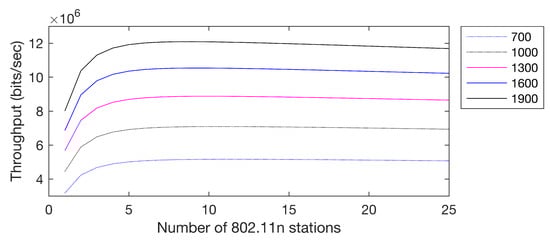 where is the probability that a station will transmit during a slot, and then p is the probability that there is a collision in that slot. The probability is considered to be equal for all stations, operating under the assumption that they are all attempting to perpetually transmit packets. This is formally referred to as the saturation condition by Bianchi []. These two expressions can be solved simultaneously for and p as a function of the number of stations (N). We use the following set of parameters for 802.11n networks: