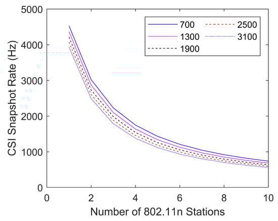 From the vertical spread of the various curves, we note that the throughput varies as a function of the packet size. This is symptomatic of the greater channel utilisation due to larger packet sizes since the stations spend less time in the inter-frame periods such as DIFS and SIFS. We further note that the decay in throughput appears to be independent of the size of the packets being transmitted. Overall, the total channel throughput decreases slightly as the number of stations increases, presumably due to the increased overhead of the distributed access protocol. This result represents the throughput in bits per second. We recall from Section 3 that CSI for Wi-Fi sensing is captured on a per-packet basis. Hence, we propose a new expression for the available CSI data rate as the quotient of throughput with the length of the transmitted packets, divided by the total number of stations as in Equation (10).