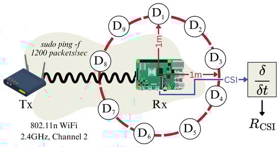 - Gringoli, F.; Schulz, M.; Link, J.; Hollick, M. Free Your CSI: A Channel State Information Extraction Platform For Modern Wi-Fi Chipsets. In Proceedings of the 13th International Workshop on Wireless Network Testbeds, Experimental Evaluation & Characterization, Los Cabos, Mexico, 25 October 2019; pp. 21–28. [Google Scholar] [CrossRef]
