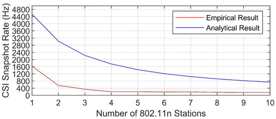 In Figure 11, we present a plot of the CSI data rate that Rx was able to achieve with varying levels of contention in the channel. The x-axis represents the number of 802.11n stations sending ping packets, and the y-axis represents the average CSI data rate that Rx was able to achieve over the duration of 60 s. The blue line represents the analytical result from earlier, and the red line is the experimentally derived result.