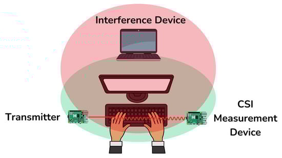 The experimental setup consists of a CSI sensing apparatus surrounded by interference devices as illustrated in Figure 10.