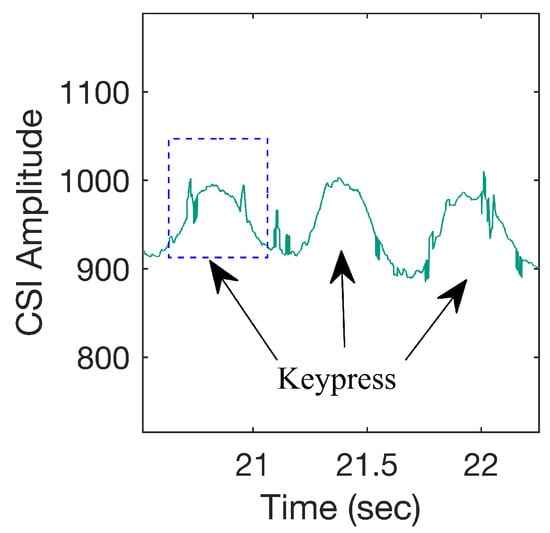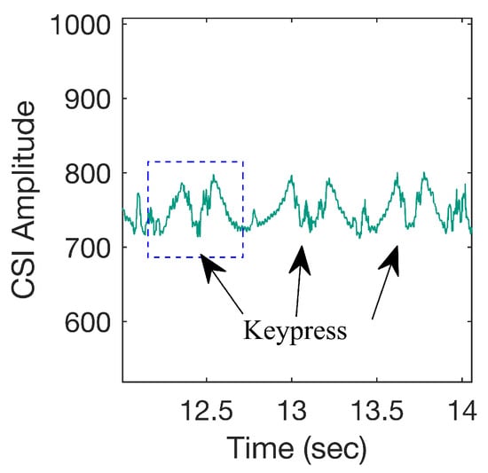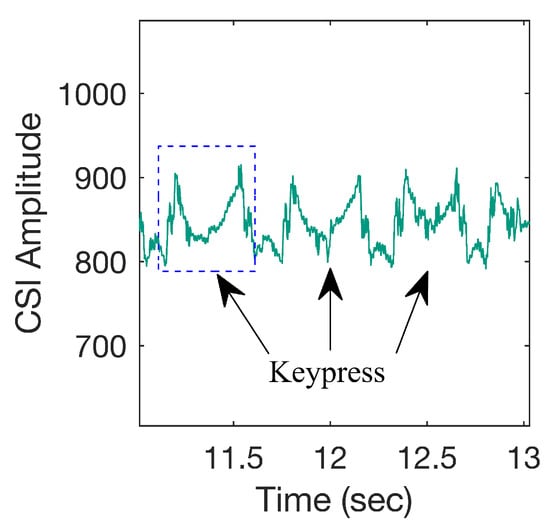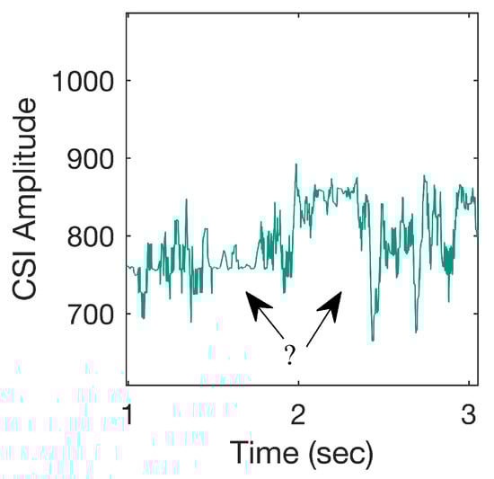 More recent work has applied advanced signal processing techniques to sense microscopic phenomena in the channel. To detect smaller changes in the channel, such as the movement of an arm [], prominent works compute advanced features such as power distributions [] or velocity distributions []. These higher-order features are typically applied with more complex learning algorithms such as Convolutional Neural Networks (CNNs) [] or Long Short-Term Memory (LSTM) classifiers []. Of particular interest to us is the application of human keystroke recognition []. WiKey and other gesture recognition algorithms use moving window approaches to identify the start and end of some gesture event []. The identified windows contain waveforms of CSI amplitudes, which vary based on the gesture (i.e., a key press), and their algorithm subsequently uses Discrete Wavelet Transforms (DWTs) and Dynamic Time Warping (DTW) to distinguish between different waveforms. This approach is similar to generalised human activity recognition, which also seeks to classify based on the frequency composition of CSI [].