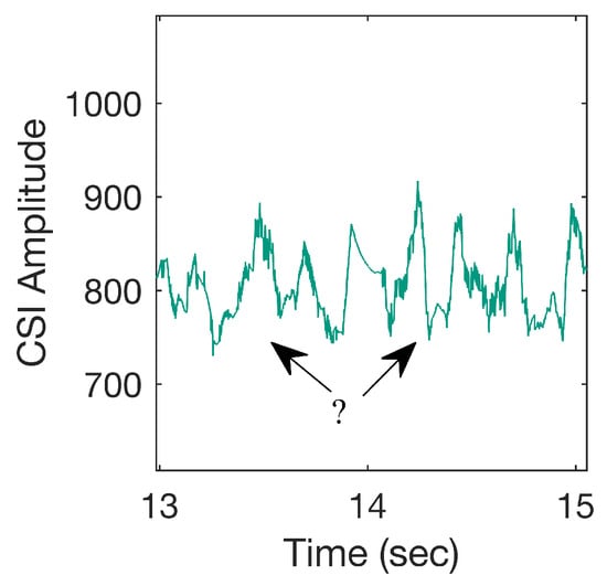 Macroscopic changes in the channel, such as the introduction of new objects, cause large-scale changes to the multipath propagation characteristics of an environment. This is reflected in CSI, which can have large changes in the amplitude level or fluctuations over a captured time series [,]. To correlate changes in CSI with the environment, the CSI is first filtered to remove noise. Common filtering approaches include Hampel filters to remove outliers [] and lowpass filters to smooth the CSI []. Following this, features can be calculated to correlate with changes in the physical environment. In applications such as object detection [,], the CSI is analysed on a frame-by-frame basis since the sensing subject is not time-varying. Hence, statistical features calculated on the set of CSI amplitudes have been used in conjunction with Support Vector Machines (SVMs) to predict the presence of different people or objects. Beyond this, large-scale changes in a physical environment such as occupancy levels have also been detected using absolute CSI amplitude levels. In addition to this, some large-scale sensing applications have used more complex temporal features calculated over the sampled time series of CSI. This includes feature calculation techniques such as Principle Component Analysis (PCA) [] and Wavelet Transforms [,], which allow temporal variations to be analysed and subsequently fed into supervised machine learning (ML) algorithms to predict behaviours such as falling, walking and waving [].