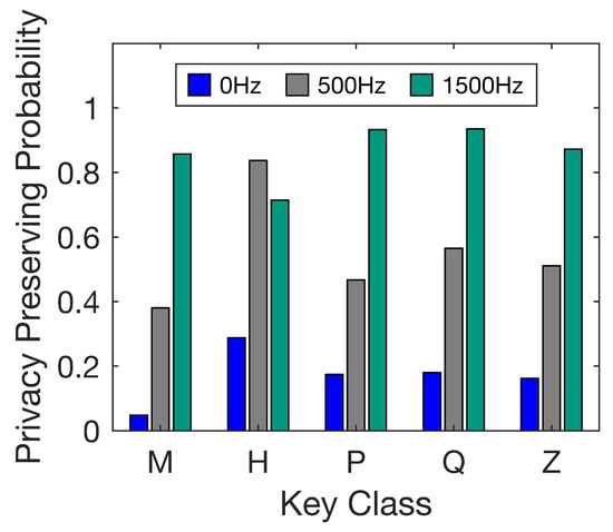 In Figure 18, we present the sensing accuracy against the interference packet rate. The x-axis represents the packet rate from the interfering laptop. The green left y-axis then represents the accuracy of the keystroke recognition system as it operates in the presence of said interference, and the blue right y-axis represents the CSI data rate under each level of interference. For each interference rate, the blue point thus denotes the achieved CSI data rate (Hz) and the green diamond denotes the achieved sensing accuracy. There is a clear negative correlation between the interference frequency and the sensing accuracy. With an initial interference rate of 50 Hz, the sensing accuracy drops from to . Beyond this, the sensing accuracy crosses below at an interference rate of 500 Hz, corresponding to a CSI data rate of 700 Hz. This corroborates our observations from Figure 13, Figure 14, Figure 15, Figure 16 and Figure 17, where the keystrokes could no longer be clearly identified with interference rates of 500 Hz. Beyond this, the accuracy appears to decay in a decreasing manner asymptotically. The poor performance of the sensing system with a CSI Data Rate of 700 Hz due to the interference injected at 500 Hz is an interesting result. We recall the earlier result in Figure 6, where a CSI sensing rate of 700 Hz was able to yield a keystroke detection rate of . Once more we reiterate that detection refers to the ability to pick up the keystroke event in the CSI time series, not the classification accuracy. Despite being able to pick up all the keystrokes, the sensing classification accuracy is below . This result corroborates the ideas proposed in Section 3, where we postulated that the dependence of Wi-Fi sensing systems on frequency-based feature engineering techniques creates a susceptibility to changes in the CSI data rate. Even though all the keystrokes are picked up within CSI, the change in CSI sampling rate distorts the DWT features and hence reduces the accuracy of the sensing system. Overall, this experiment clearly shows that minimal interference can still be effectively used to defend against Wi-Fi sensing. To further visualise the improvement in privacy, we define the Privacy Preserving Probability (PPP) metric as the percentage probability of safeguarding a key from being detected by Wi-Fi sensing. This is calculated as the complement of the true positive detection rate for each key. We plot the PPP under several rates of defensive interference in Figure 19. The x-axis represents the five keys that the Wi-Fi sensing system is attempting to detect. Then, the height of each column represents the PPP with different levels of defensive interference. We observe that the PPP generally increases as a function of defensive interference. Generally, the PPP is higher for all keys when comparing 500 Hz interference with 0 Hz interference, and higher again when comparing 1500 Hz interference. This is congruent with our results in Figure 13, Figure 14, Figure 15, Figure 16 and Figure 17, where increasing amounts of interference resulted in more degraded CSI waveforms. With 1500 Hz of interference, we can safeguard all keys with an overall PPP of , an improvement of over the baseline. Compared with prior work, the result with 500 Hz of interference demonstrates that lesser amounts of interference can considerably improve user privacy. One aspect of this result which is unclear is how to choose an appropriate level of interference. At the outset of this paper, we discussed prior work that belligerently injects dense packet streams to maximally thwart CSI. In lieu of this, our goal is to be more conservative in our application of interference to sufficiently impede sensing accuracy without overconsuming channel resources.