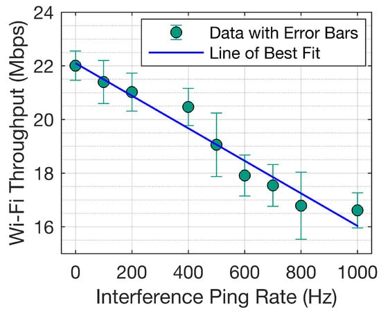 To evaluate the effect of interference defence on Wi-Fi bandwidth, we introduce a server–client pair to the experimental environment. Utilising the same setup illustrated in Figure 12, we position a Transmitter (Tx) in the channel, which propagates ping packets at a rate of 1000 Hz to a CSI measurement device. Meanwhile, an interference device is positioned adjacent to Tx. The independent variable is the rate of interference packet propagation, which we vary between 0 Hz and 1000 Hz. Concurrently, the server-client pair on the same Wi-Fi channel ( GHz, Channel 2) transfers a 200 MB file over the wireless link. The dependent variable is the time taken for this file to transfer from the client to the server, which we subsequently convert to a bandwidth in Mbps.