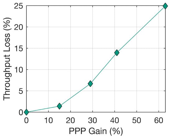 Figure 20 and Figure 21 demonstrate the effect of interference on channel throughput. In Figure 20, the Wi-Fi throughput is plotted against the interference rates due to injected ping packets. A clear negative correlation between interference rate and Wi-Fi throughput is observed, as the linear fit has an RMSE of and of . Overall, an interference rate of 1000 Hz causes a large reduction in throughput for the client–server pair. This once more motivates the use of more conservative interference injection to minimise throughput loss. The linearity of this trend is an interesting result, and can be compared against Figure 11. In Figure 11, the achieved CSI rate, which is proportional to throughput as per Equation (10), approaches an asymptote with the introduction of more devices. Due to hardware constraints on the Raspberry Pi 4B, we were unable to investigate whether the linear trend in Figure 20 approaches an asymptote with further increases in the transmission rate. We motivate future work to investigate this, when commodity devices are able to propagate more dense packet streams. To visualise the trade-off between the security and channel utility, Figure 21 plots the PPP gain against the measured throughput loss. Here, the PPP gain is the percentage increase in the PPP over the baseline scenario with no interference. We observe a clear trade-off between the PPP gain and the available throughput. To achieve a PPP gain of , we sacrificed nearly of the available Wi-Fi throughput. Initially, we observe that a gain in the PPP can be achieved with only loss of throughput. This corresponds to the case of interference at a rate of 200 Hz. Referring back to Figure 18, this conservative interference rate is sufficient to reduce the keystroke sensing accuracy below . The trade-off becomes more severe beyond this, as shown by the increasing slope of the curve in Figure 21. A further gain in the PPP (from to ) entails a much larger throughput loss of . These results demonstrate the effectiveness of conservative interference injection in significantly mitigating sensing threats, while having minimal impact on Wi-Fi throughput.