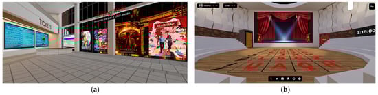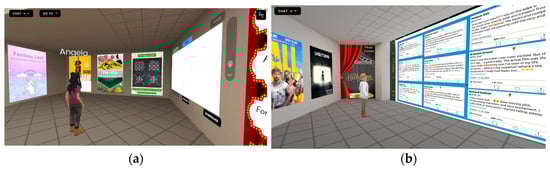 Snapshots of the VR escape room game. (a) The lobby and ticket counters. (b) The final room.