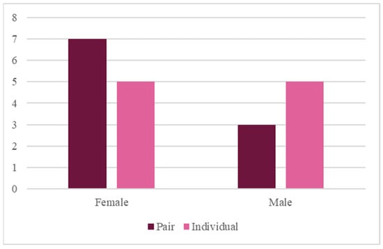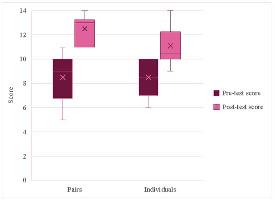 In terms of academic performance, overall, both groups improved (Figure 5), except for two learners in the control group, who scored the same both in the pre-test and in the post-test. A Wilcoxon signed-rank test comparing the pre- and post-test results of each group indicated a statistically significant difference for both pairs (p = 0.005 < 0.05) and individuals (p = 0.011 < 0.05). Looking at the mean score for each one of the groups, both started with a mean pre-test score of 8.50, but the post-test mean score for pairs was 12.50, whereas for individuals, it was 11.10. Performing a Mann–Whitney U-test on the post-test scores of the two groups showed a statistically significant difference (p = 0.041 < 0.05), indicating that the group in which learners worked collaboratively had a better final performance. However, when performing the same test on the difference in pre- and post-test scores between the two groups, the results showed a p value greater than 0.05 (p = 0.069), which means that there was no statistically significant difference in improvement between the two groups.