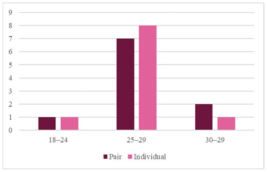 From the total of 20 participants, 12 (60%) were female and 8 (40%) were male, while the predominant age group was between 25 and 29 years old, accounting for 75% of the population (n = 15), with three participants being 30–39 (15%) and two being 18–24 years old (10%). Gender-wise, participants were equally split in the control group, whereas in the experimental condition, there were seven female and three male participants (Figure 3). Age distribution was fairly similar between the two groups (Figure 4).