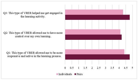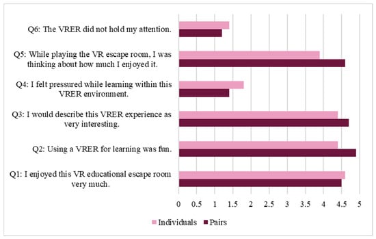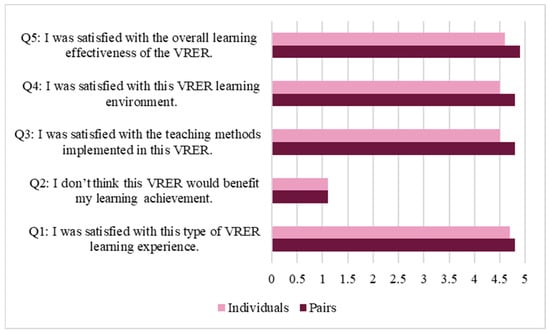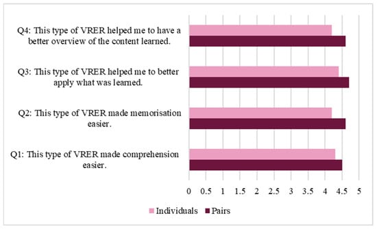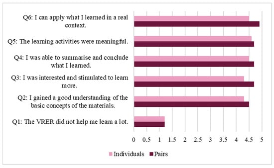 Based on the results from the learning experience questionnaire, it appears that learners who completed the VRER in pairs had slightly better perceptions regarding their learning effectiveness compared to those who played individually (Figure 6). Q1 was a reverse question, reading, “The VRER did not help me learn a lot”. Participants of both groups seemed to agree on the fact that this was not the case by rating the statement with an average of 1.2. In general, all questions yielded positive results for both groups, indicating that both pairs and individual learners consider the VRER an effective learning method. However, running a Mann–Whitney U-test on the overall construct of perceived learning effectiveness by calculating the mean for each question revealed no statistically significant difference (p = 0.132 > 0.05) between pairs and individuals. It should be noted that, for all categories, reverse questions were taken into consideration, and their score items were reversed before running the tests to ensure that the results reflect the true differences between groups.