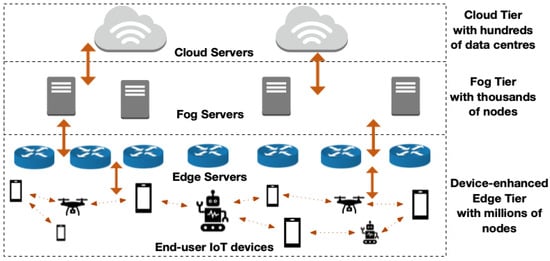The edge-fog-cloud architecture is commonly envisioned as a 3-layered model [7,8,9]. In this model the edge layer is at the bottom and directly connected to end-user IoT devices, the middle tier is composed of fog nodes, and the cloud layer is at the top, as shown in Figure 1. There are other interpretations of how the interactions between edge, fog, and cloud may occur [10], and this paper follows the model in Figure 1. In this paper, we envision a computing architecture where the IoT devices themselves are utilised as edge resource providers. The idea of a collection of end-user IoT devices collaboratively working as a collective computing resource has been explored in the literature under various terms, such as ‘mobile device clouds’ [11], ‘mobile edge-clouds’ [12], ‘human-driven edge computing [13], ‘collaborative multi-device computing’ [14], ‘mobile crowd computing’ [6] and ‘device-enhanced multi-access edge computing’ [5] (device-enhanced MEC). In this paper, we use the term ‘device-enhanced MEC’ to refer to the bottom tier of Figure 1, which provides edge computing services to end-user IoT devices.