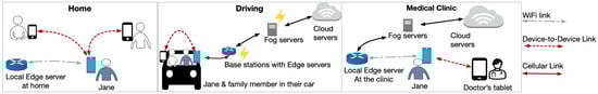 In Figure 2, when Jane is at home, Jane’s smartphone connects her to a local collective resource, made up of the collective resources of her family members’ smartphones and her home edge server to carry out the sensor data processing tasks. In this situation, all of the participating resource nodes can be considered to be at the edge. Since all of the nodes are trusted, and connectivity is robust, Jane does not have the need to request the support of remote servers.