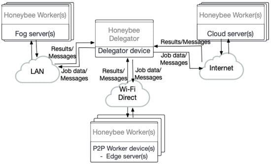 The Honeybee framework (https://github.com/niroshini/honeybee, accessed on 18 December 2023) is an Android implementation of the Honeybee mode [6,39], and enables the formation of mobile edge clouds, via peer-to-peer (P2P) connections using Wi-Fi Direct. In the Honeybee model, the device with the task to be completed is called the ‘delegator’. The original task is first decomposed to a pool of jobs, and then is offloaded to ‘worker’ devices in the vicinity, while also carrying out a portion of the jobs by itself. Honeybee’s task-scheduling algorithm is based on work stealing [40] to automatically load-balance the jobs amongst the delegator and the workers. The workers must proactively request to ‘steal’ jobs, and each time the delegator receives a steal request, it will respond to the requesting worker with a chunk of jobs. In this way, faster workers are able to steal more and more jobs, thus avoiding performance bottlenecks with faster nodes having to wait for slower nodes. The Honeybee model is also able to handle random disconnections as well as exploit random resource node encounters. To address the critical aspect of incentivising participation of workers, we have previously explored the socio-technical requirements and engineering challenges of this paradigm, identifying effective incentive mechanisms [41]. Our findings provided insights into aligning user motivations with application goals through both intrinsic-social and extrinsic-personal incentives, ensuring sustained engagement while mitigating resource depletion concerns. However, in this work, we do not focus on the design of incentive structures, instead assuming that appropriate mechanisms are already in place across the edge, fog, and cloud layers to support inter-tier collaboration. In this paper, we build on the Honeybee model to extend the cooperative work-stealing mechanism beyond the original Honeybee’s local device cloud. We have extended the Honeybee delegator to be able to simultaneously maintain connections with multiple P2P edge servers via Wi-Fi Direct, as well as fog and cloud servers via the LAN and the internet, respectively. The Honeybee worker component has been extended to include support for Java implementations on fog and cloud servers. While our previous work [38] extended the Honeybee framework to support sequential dependency tasks, this study does not utilise the dependency-enabled extension, as it lies beyond the scope of the present investigation. Figure 3 shows a high-level view of the architecture of the extended framework for Edge-Fog-Cloud collaboration.